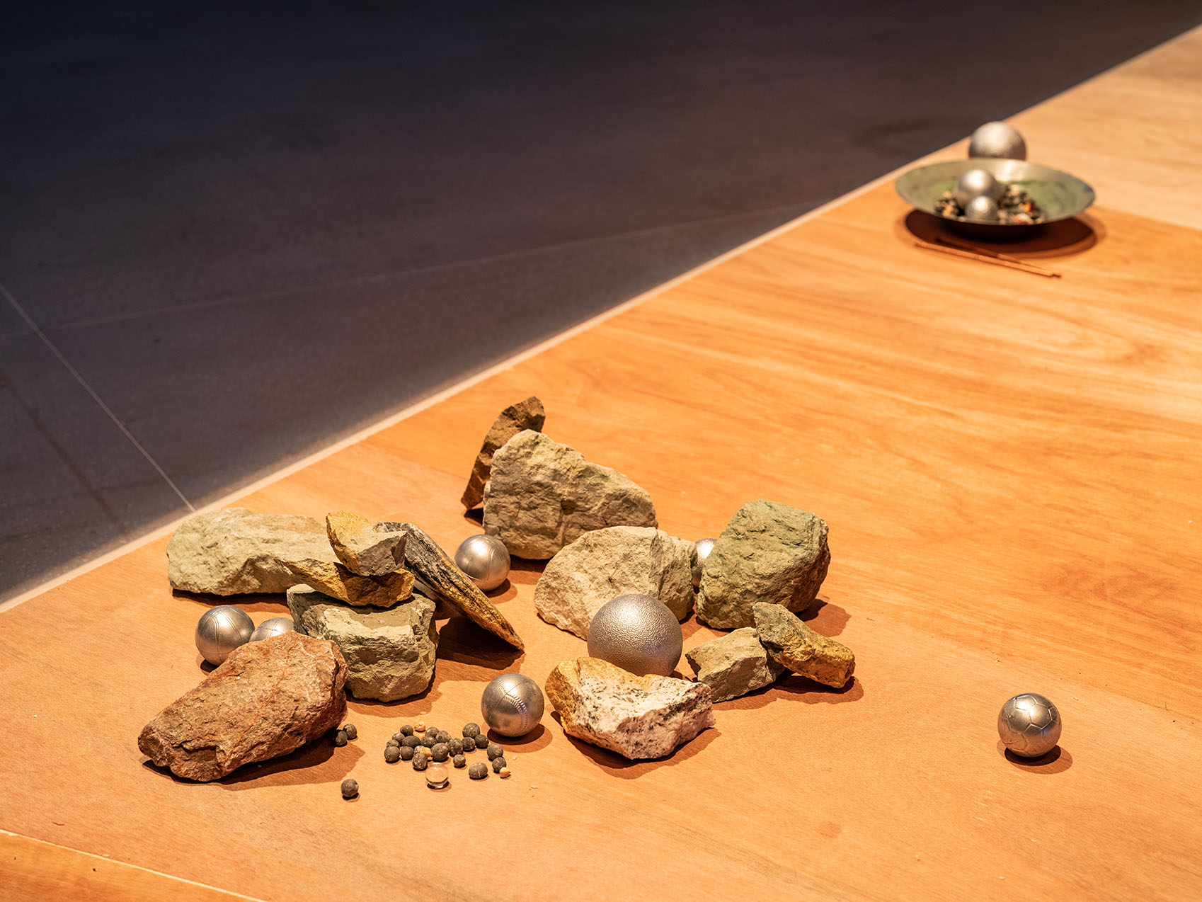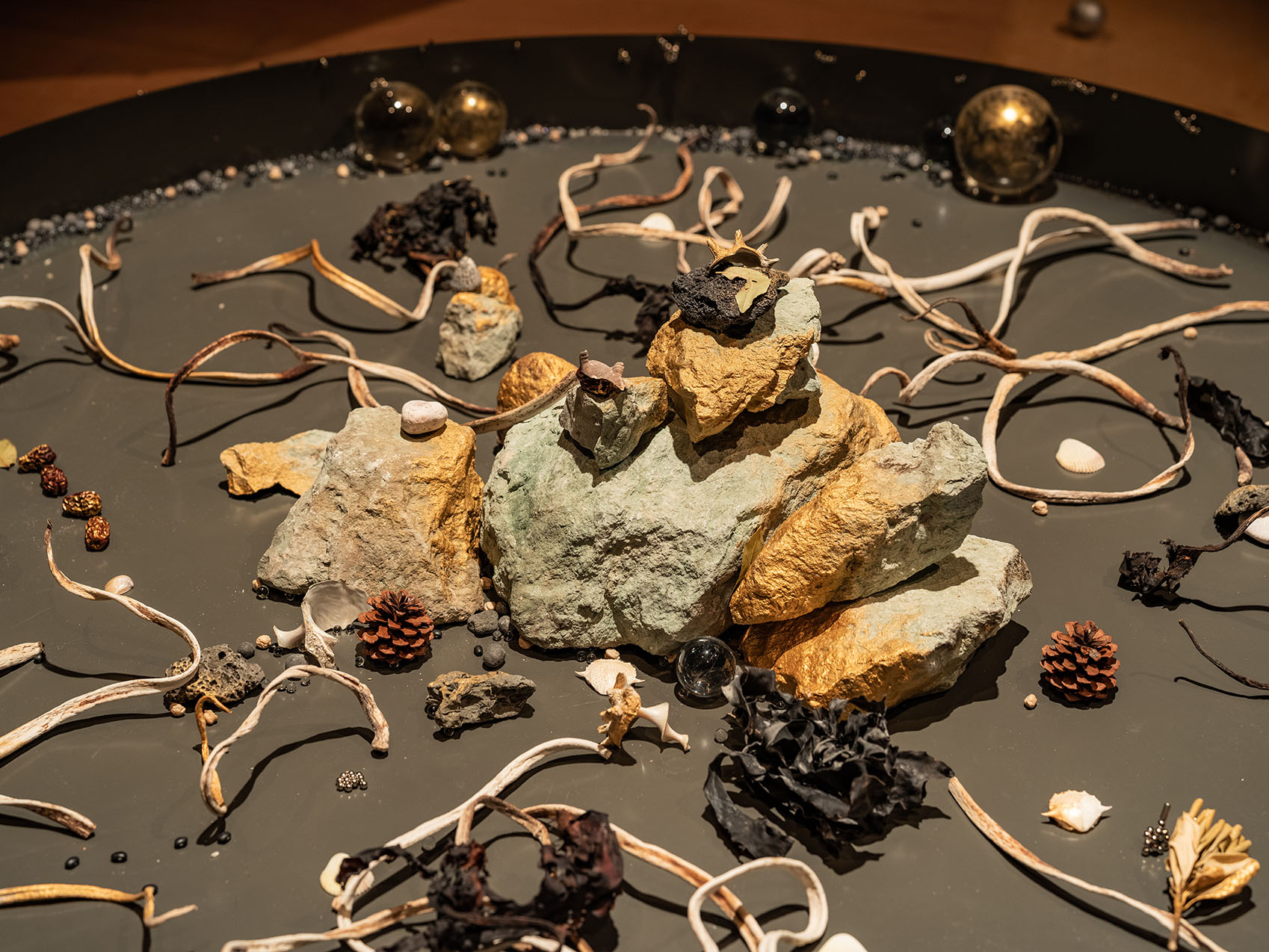 The Lunar Continues_ Iron, wood, rice, glass beads, magnets, fruits, stones, dried sea creatures_ 2022