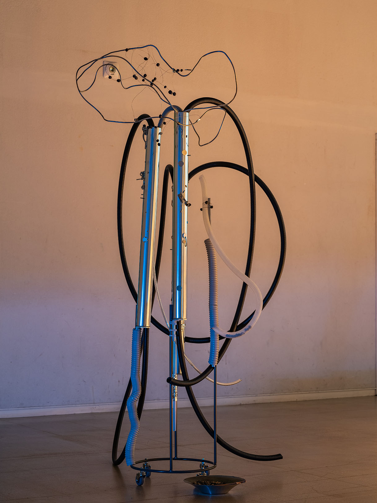 Jamming by Dreams_ pipes, rubber, iron, wire, clay, plastic, rubber wheels_ 2022