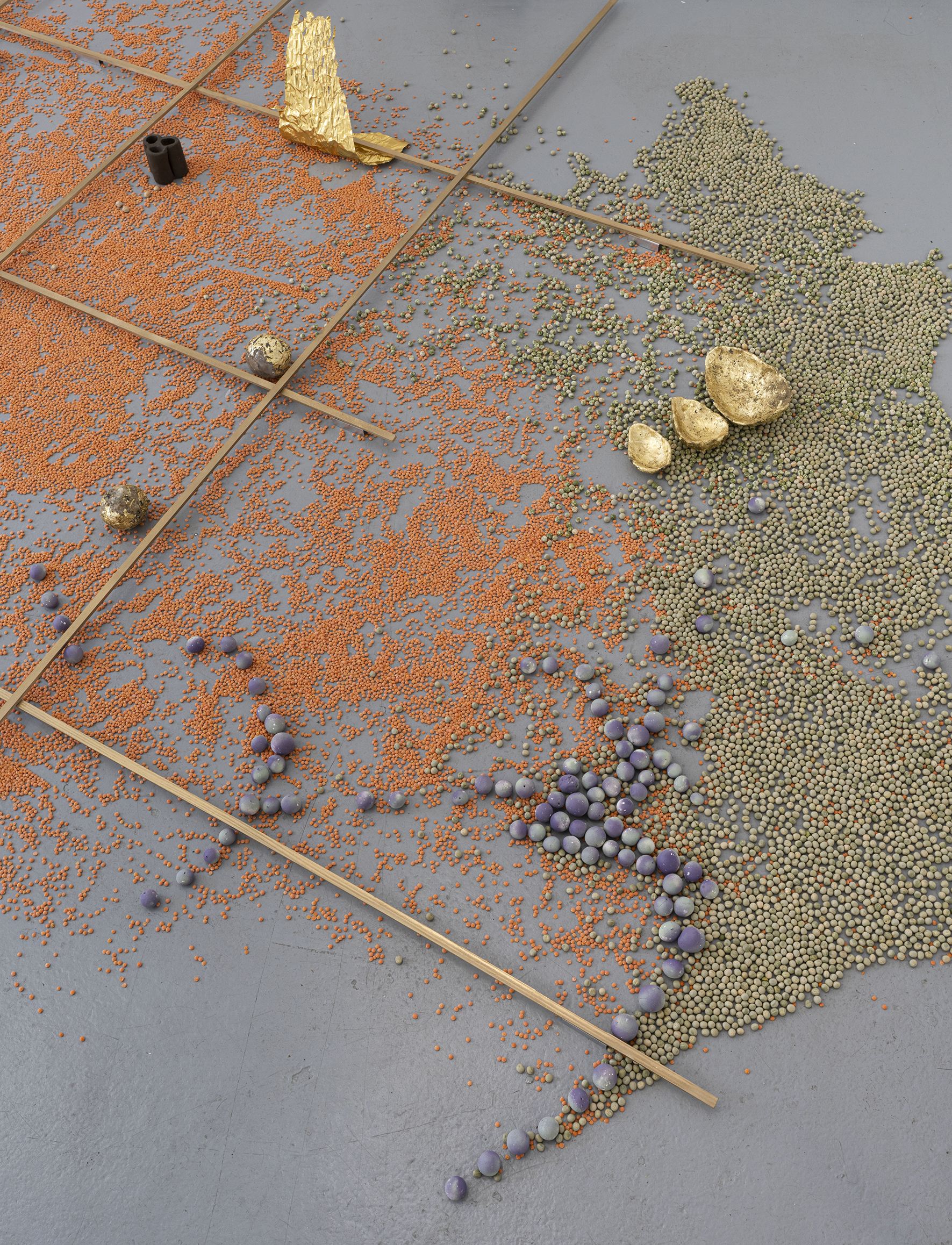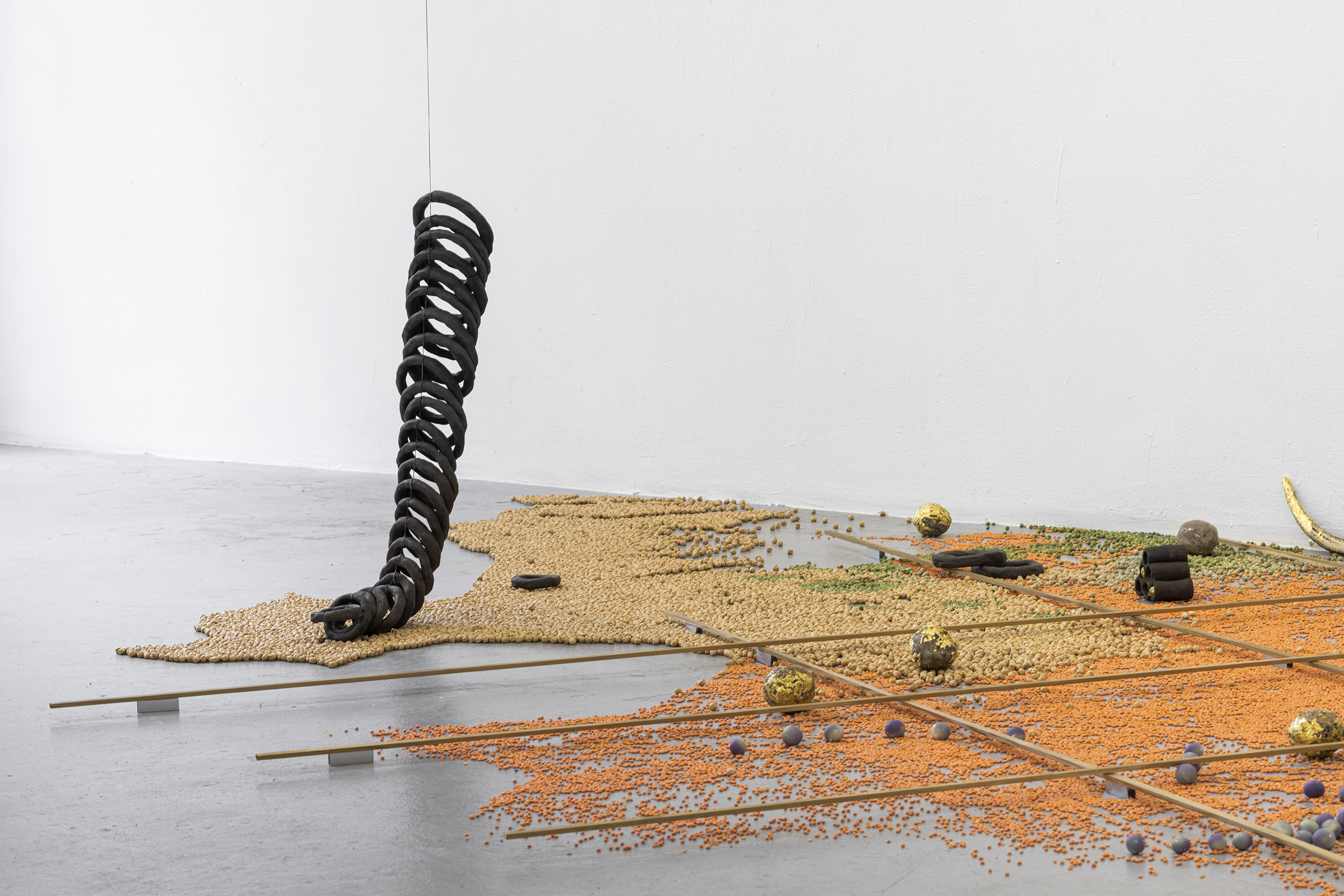 〈A SYMMETRICAL FUTURE THAT NO ONE CAN EQUALLY EVER REACH〉(2023)은 공간의 벽과 바닥 전체로 확장되는 설치 작업으로, 장벽과 분리, 경계와 위계로부터 벗어나 위험한 물질 세계 속에서 끊임없이 흐르고 교차하는 사변적이며 우발적인 사건들의 연속으로 구성된다.