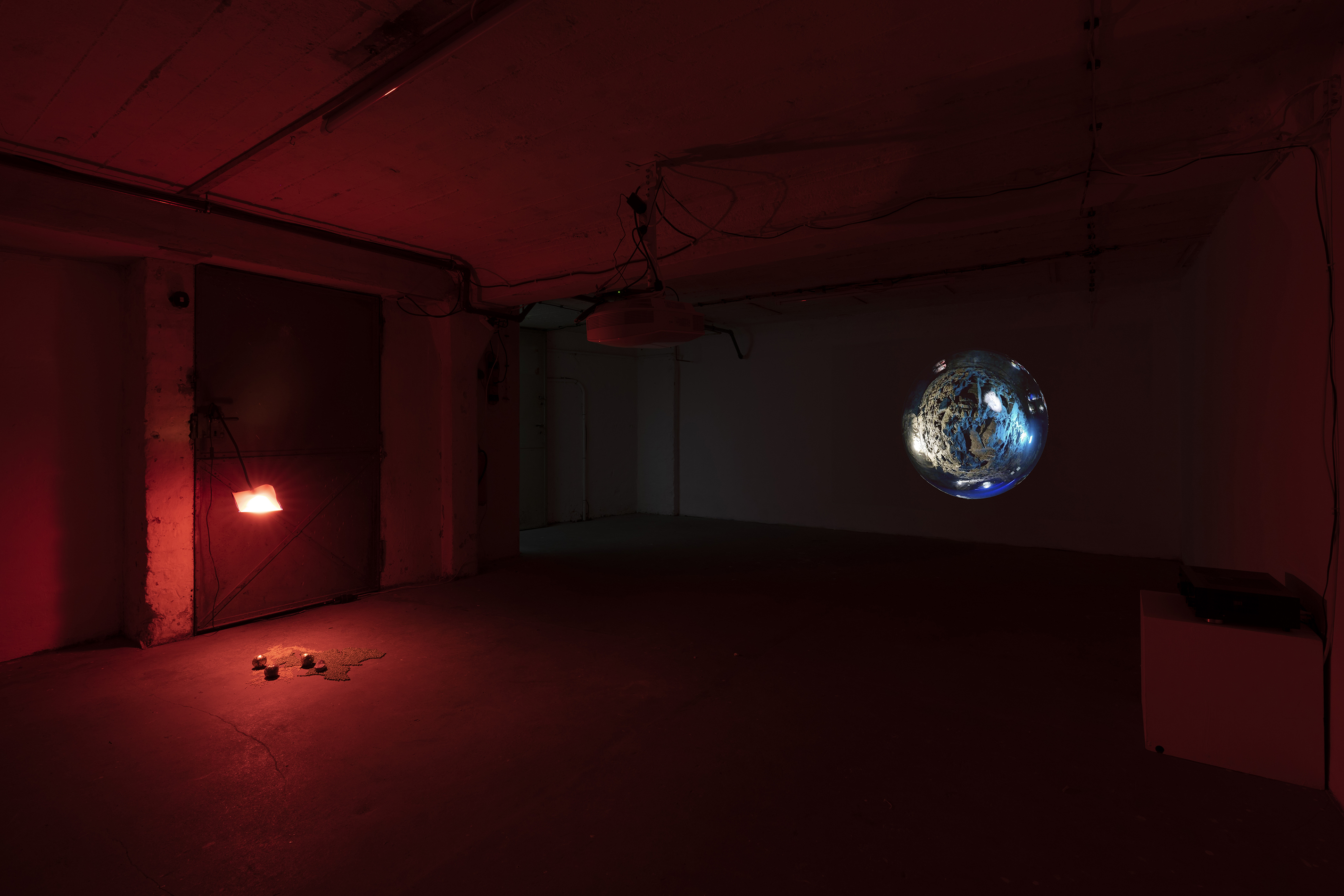 A SYMMETRICAL FUTURE THAT NO ONE CAN EQUALLY EVER REACH(2023) spreads across the walls and floor of the space, the installation is a series of speculative and accidental events that, free from barriers and separation, boundaries and ranks are flowing continuously through the dangerous material world.